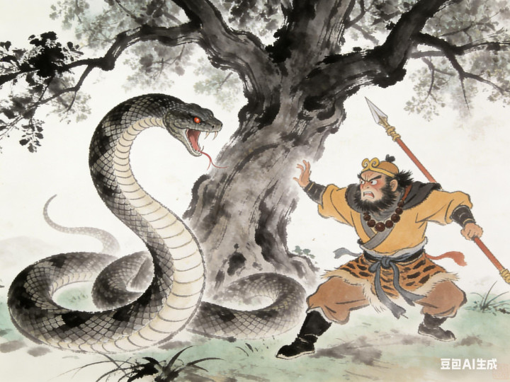 沙僧不慌不忙,举起降妖宝杖与巨蟒斗了起来。