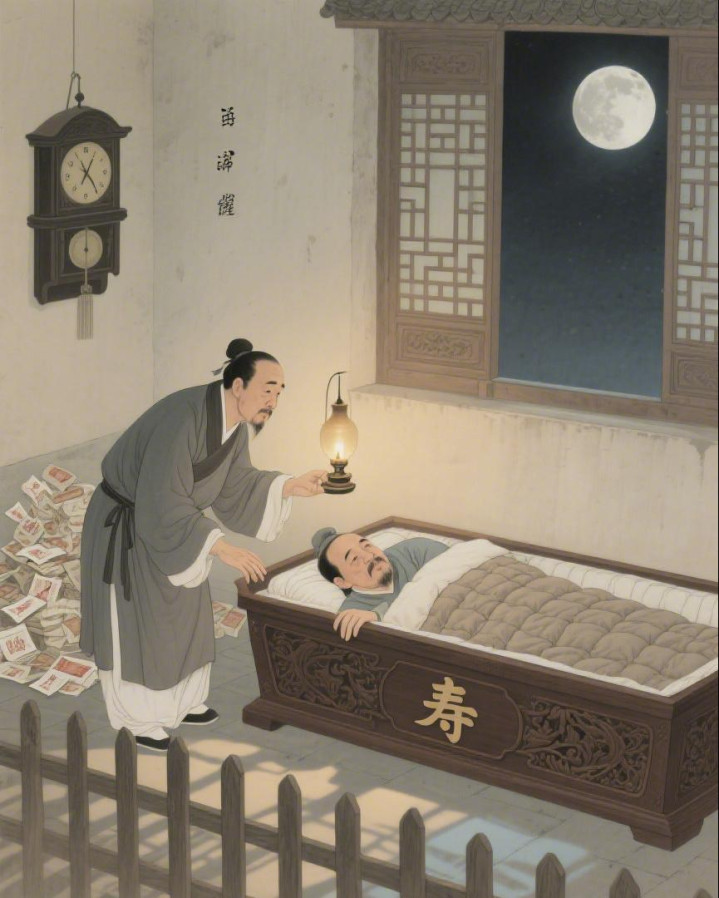 到了傍晚,马德厚换了身素白的穿着,吩咐管家孙福:“子时之前,把我放进棺材里,钉上棺盖。等天亮之后,再把我放出来。”