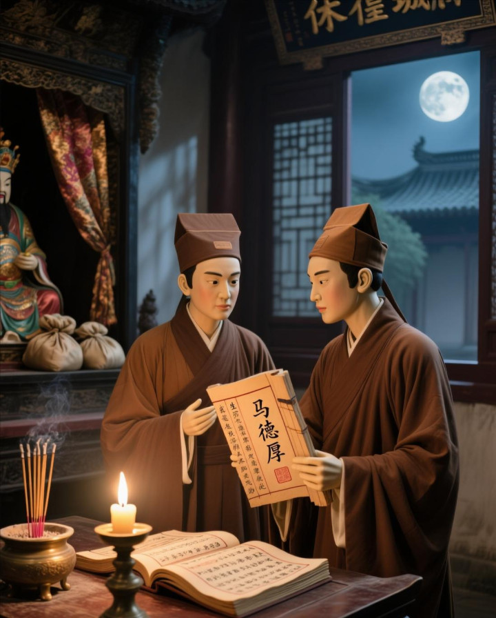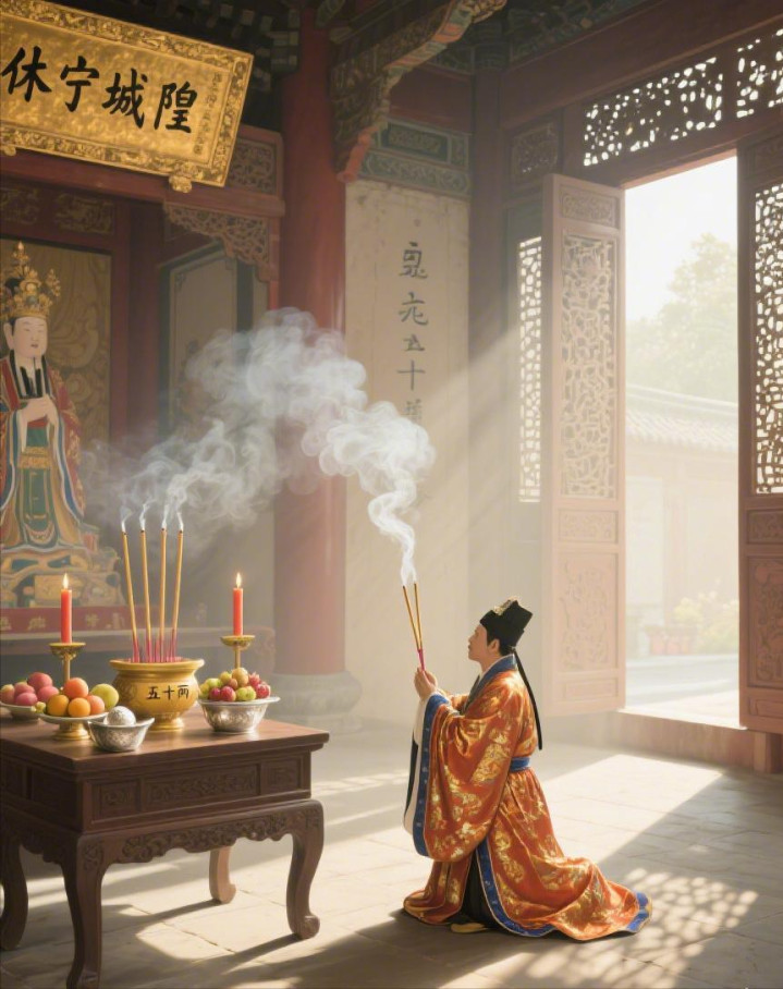 第二天一早,马德厚沐浴更衣,带着香烛供品,来到了休宁县城隍庙。他在大殿上毕恭毕敬地上了三炷香,磕了三个响头,又捐了五十两银子的香火钱,这才心知足足地准备离开。
