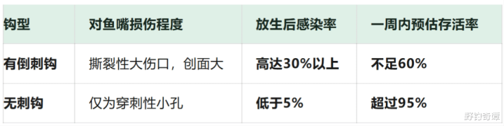而用无刺钩,情况就大不疏通。有水产大众作念过施行,对比有倒刺钩和无刺钩对鱼类放生后的存活率: