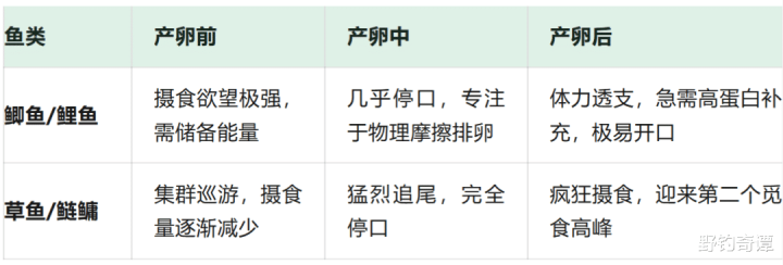 从表中不出丑出,我们常说的“鱼好钓”,其实指的是产卵前和产卵后。