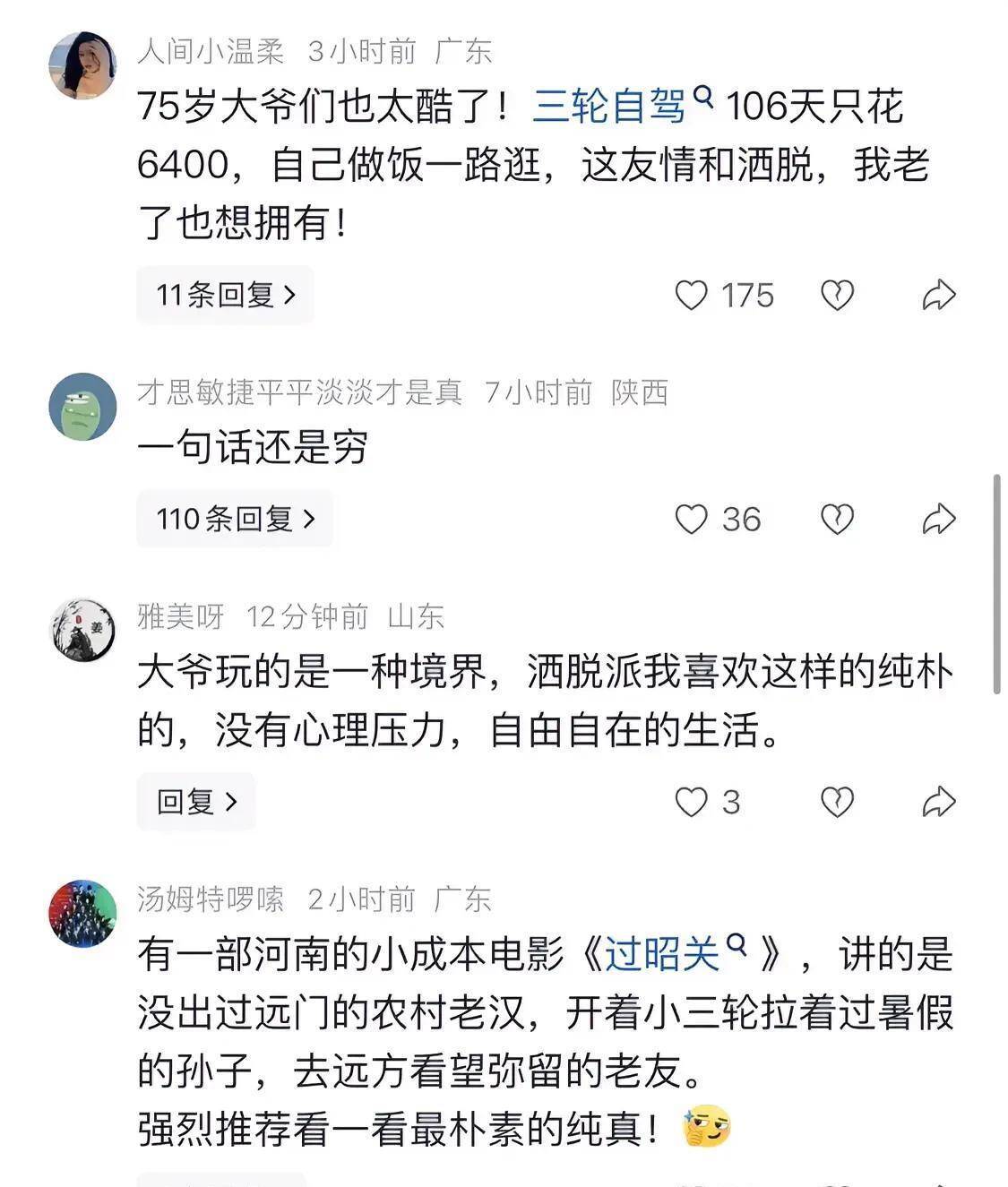 有网友暗示,大爷玩的是一种意境,超逸派我心爱这么的纯朴的,博亚体育app莫得心理压力,目田安适的生涯。有网友感叹,75岁大爷们也太酷了!三轮自驾106天只花6400,我方作念饭沿路逛,这友情和超逸,我老了也念念领有!