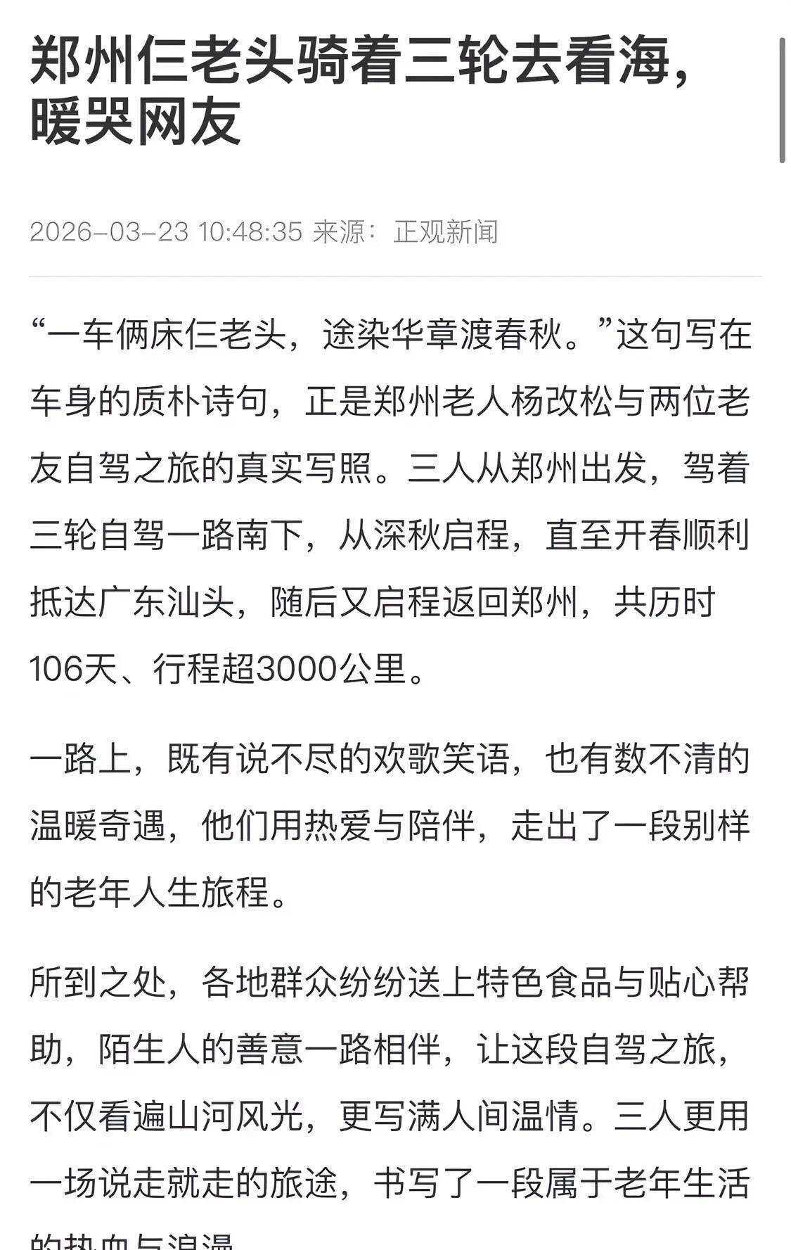 据媒体报说念,郑州中牟三位平均75岁的老东说念主,驾驶改装三轮车开启跨省之旅,106天穿行8省、行程超3000公里,三东说念主共计耗尽仅6400元。车身“梓里河南 一车俩床仨老翁,途染华章渡春秋”的字句,说念尽朴素自便,也让宽绰网友为之动容。
