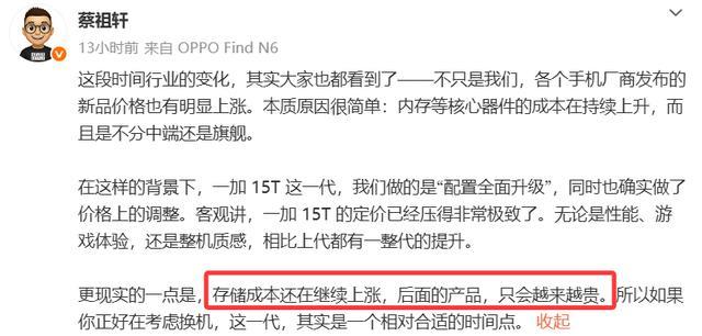 OPPO高档公关司理蔡祖轩在酬酢平台上暗意:存储老本还在不时高潮,背面的家具只会越来越贵。提倡宇宙心爱一加15T的话,不错赶早下手。