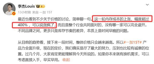 关于一加总裁解说为什么一加15T加价这样多,原因是内存涨了400%,基本上算是涨上天了,同期暗意一加15T这样的订价,也曾是尽了最大戮力,你怎样看?